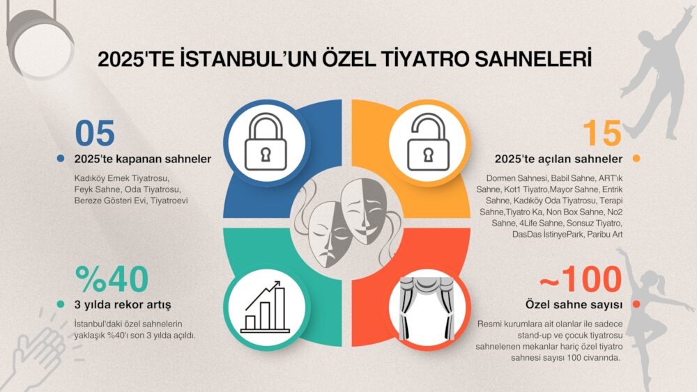Aynı zamanda 2025, yeni açılan bağımsız tiyatro sahneleri açısında en bereketli yıllardan biri oldu. Maltepe’de Dormen Sahnesi ve Babil Sahne, Ümraniye’de ART’ık Sahne, Kadıköy’de Kot1 Tiyatro, Mayor Sahne, Entrik Sahne, Kadıköy Oda Tiyatrosu, Terapi Sahne ve Tiyatro Ka, “Biz de varız” diyerek kapılarını açtı. Beyoğlu’ndaki Non Box da 2025’te izleyici ağırlamaya başlayan sahnelerden oldu. Daha önce atölye çalışmaları yürütülen Kadıköy No2 Sahne (Baysan Pamay Salonu) ile Maltepe’deki 4Life perdelerini izleyicilere açtı. Şişli’de kapanan Oda Tiyatrosu’nun yerine Sonsuz Tiyatro açıldı. Entrik Sahne bazı sorunlar nedeniyle şimdilik faaliyetini durdursa da, yeni yer arayışı devam ediyor.