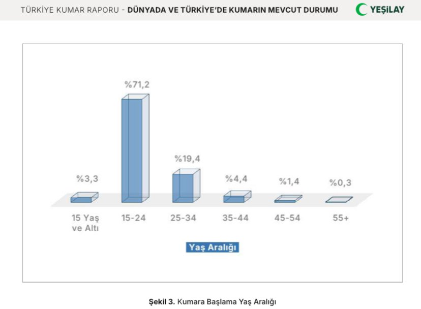 Yeşilay ve Sağlık Bakanlığı’nın birlikte hazırladığı “Kumar Raporu”, gençler arasında kumar bağımlılığının 2025 tablosunu çizdi. Buna göre Türkiye’de kumara başlama yaşı 15. 15 yaş üzerindeki her 10 kişiden biri hayatında en az bir kez kumar oynadı. Ki bu, yaklaşık 6,8 milyon kişi demek. Kumar oynayanların yüzde 71’i 15-24 yaş arasında. Yüzde 19’u, ilk kez kumar oynadığında 25-34 yaş aralığındaydı. Rapora göre, sanal bahis giderek bir halk sağlığı sorunu haline geliyor.