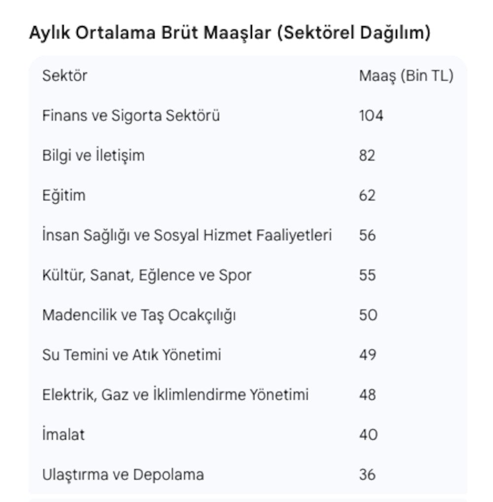 TÜİK raporunda, bir çalışanın işverene ortalama maliyetinin yanısıra ortalama brüt maaşlara da yer verildi. Buna göre, 2024 yılında aylık brüt ortalama maaşın en yüksek olduğu 10 işkolu şunlar: