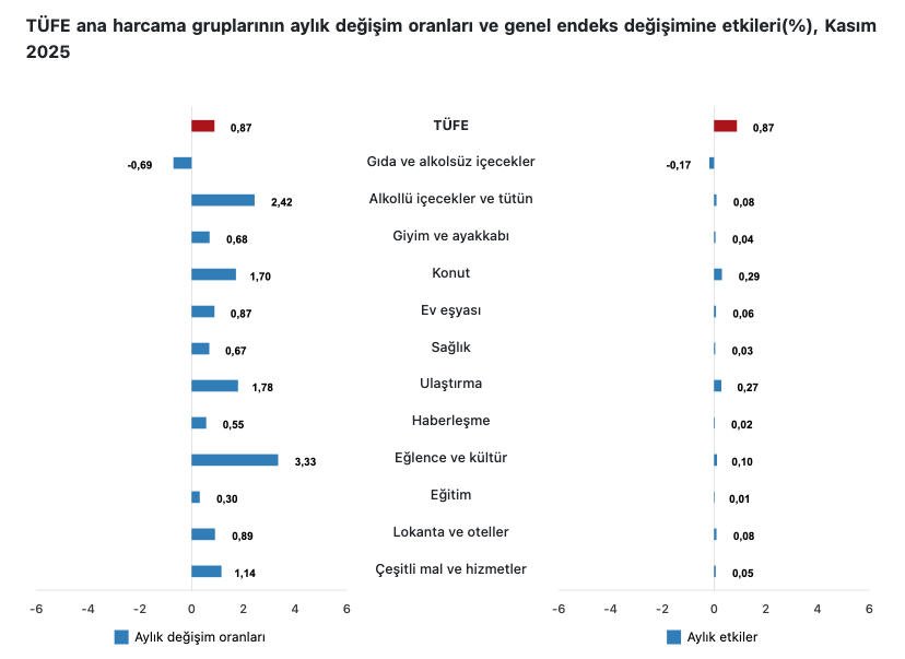 Türkiye İstatistik Kurumu (TÜİK), kasım ayı enflasyon rakamlarını açıkladı. İstanbul Ticaret Odası’nın yüzde 1,19, Enflasyon Araştırma Grubu’nun (ENAG) ise yüzde 2,13 olarak hesapladığı kasım ayı enflasyonu TÜİK’e göre yüzde 0,87 düzeyinde gerçekleşti.
